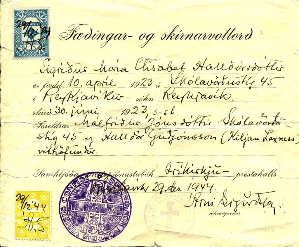 María S. Halldórsdóttir fæddist í Reykjavík 10. apríl árið 1923. Hún var ávöxtur ástarævintýris í Rönne á þeim fagra Borgundarhólmi í Danmörk. Móðir Maríu, Bjarný Málfríður Jónsdóttir var vinnukona á Íslands- og kaþólsk-tengdu heimili. Þangað leitaði Halldór Guðjónsson, sem varð einnig Laxness og Kiljan. Í upphafinni sumarbirtu Borgundarhólms faðmaðist unga fólkið. En Halldór var á suðurleið en Málfríður hélt í vestur. Hann gekk með kaþólskuna í huganum en Málfríður með Maríu í lífinu. Hann fékk bréflega – inn fyrir klausturveggina – fréttir af þungun og fæðingu dóttur sinnar. Foreldrar Málfríðar tóku á móti dóttur sinni – barni aukinni – með kærleika og umhyggju og móðir Halldórs og systur reyndust einnig hið besta og urðu Maríu skjól fyrr og síðar.