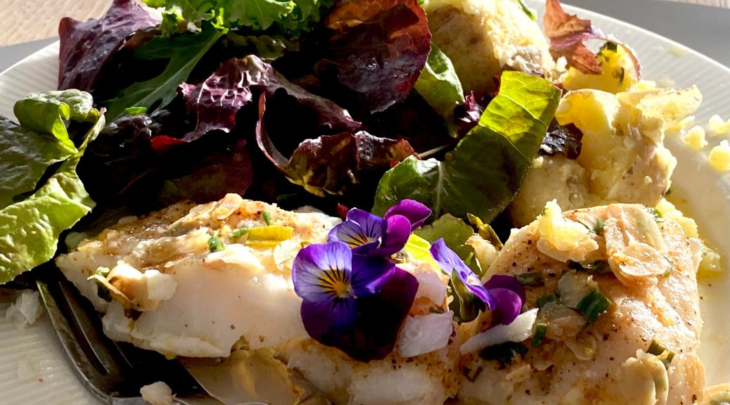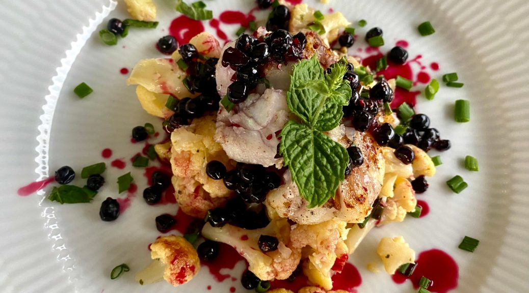 Er hægt að nota krækiber með fiski? Á berjatíma og þegar grænmetið er tilbúið í garðinum er gaman að leika sér með afurðirnar. Vinir komu í heimsókn. Við ákváðum að elda þorsk, nota blómkál og prufa krækiberjasultu með. Þá varð til þessi réttur. Þegar búið er að sjóða og steikja er blómkáli komið fyrir á diski, fiskurinn settur yfir. Svo er ferskt krydd látið falla yfir. Krækiberjasósunni er síðan dreift af hógværri smekkvísi og öguðum einfaldleika yfir fisk og í kringum hann. Kraftaverkin verða þegar vinir hittast, hjartastöðvar eru opnar og matarástin lifir.